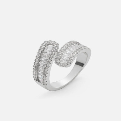 خاتم نسائي بتصميم كلاسيك باللون الفضي ، خاتم بتصميم متداخل يتزين بفصوص من الزركون اللامع ، اضيفي لمسه أنثويه راقيه الى طلتك مع هذا الخاتم ، خاتم يناسب إطلالتك المسائية .